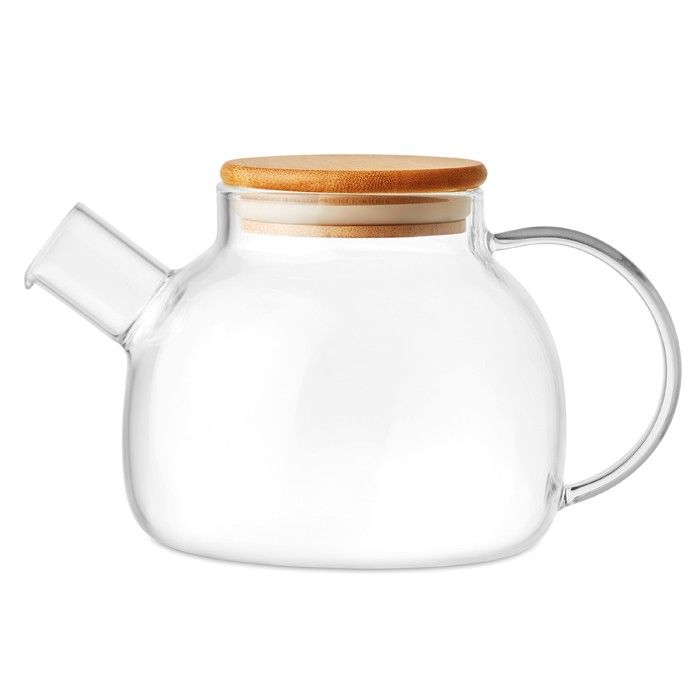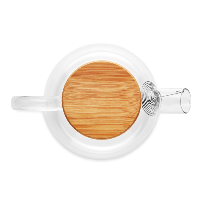 Tetera de vidrio de borosilicato personalizable con logotipo. Cuenta con infusor de acero inoxiidable y tapa de bambú y puede contener hasta 850 mililitros. El bambú, al ser un material natural, puede tener ligeras variaciones en color y tamaño según el artículo, lo que afectaría al resultado final de la impresión.