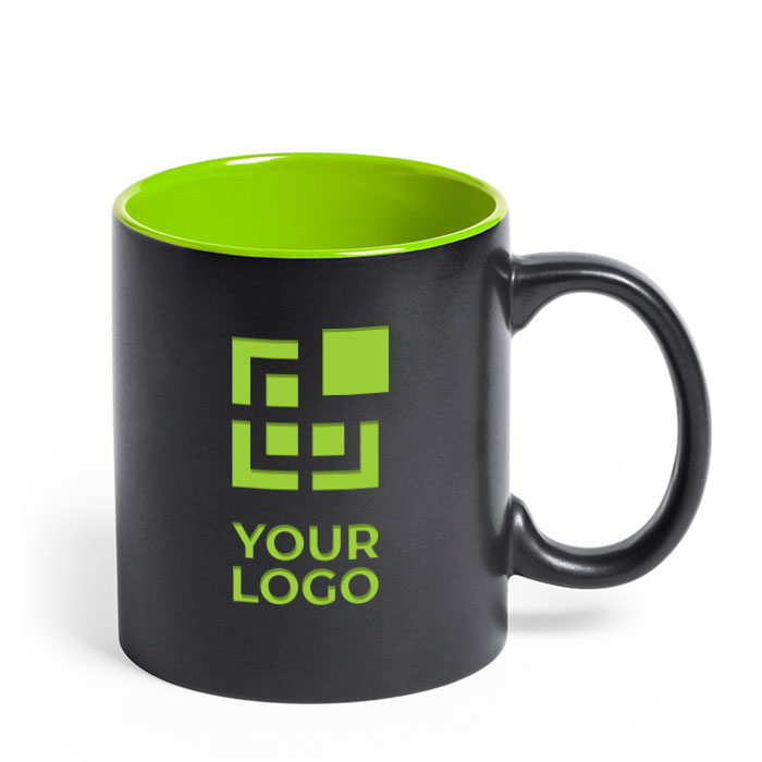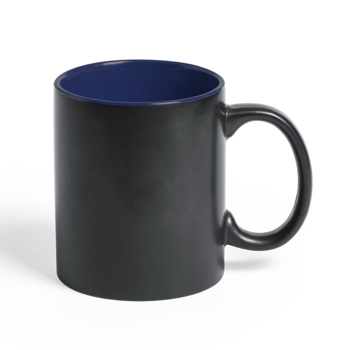 Taza de cerámica de alta calidad de 350ml. Parte exterior en color negro, diseñada para marcaje en láser, e interior en vivos colores. Al grabar el logotipo en la parte exterior, se muestra el color del interior de la taza. Presentada en caja individual.