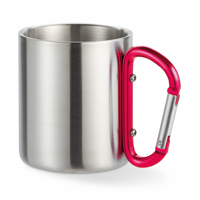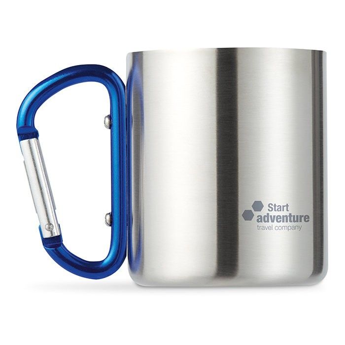 Taza metálica con asa de mosquetón y doble pared de acero inoxidable. Esta taza cuenta con una capacidad de 220ml. Se puede personalizar con tu logotipo hasta un máximo de 4 colores o con una grabación a láser apta para la lavavajillas. Una Taza metalica personalizada muy original para empresas que quieren dar una imagen aventurera a tu marca.