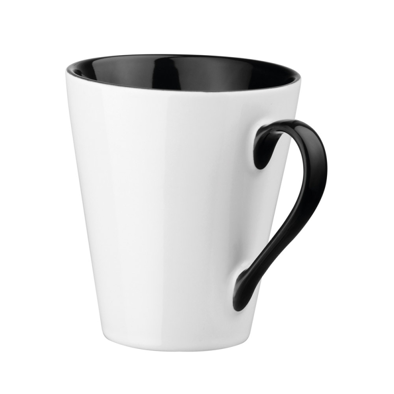 Tazas de cerámica para personalizar con tu logo. Estas cuentan con un diseño en color blanco pero pudiendo escoger el interior y el asa entre una amplia gama de colores. Puede contener hasta 320 mililitros y viene en caja individual.