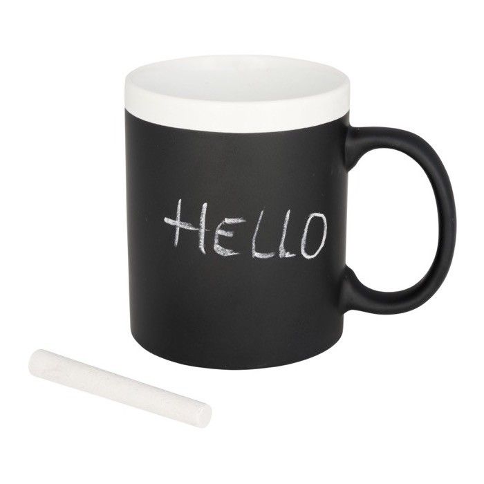 Taza de cerámica de 330ml. Se puede personalizar escribiendo en el acabado de la pizarra con tiza (incluida). Apto para lavavajillas de acuerdo con EN12875-1 (al menos 125 ciclos de lavado) para todos los métodos de marcaje. En caja de cartón blanca.