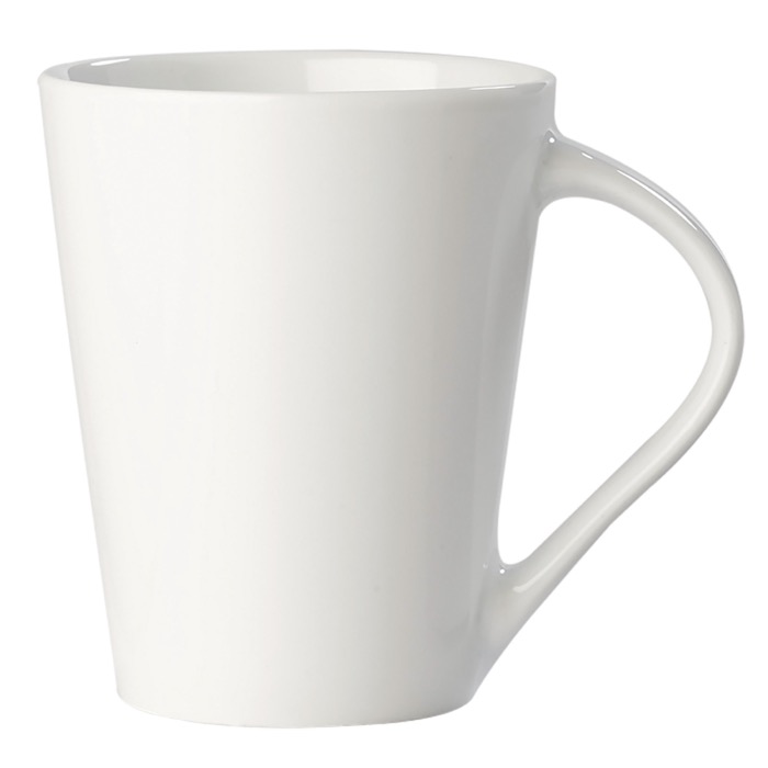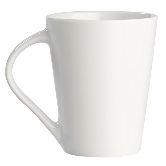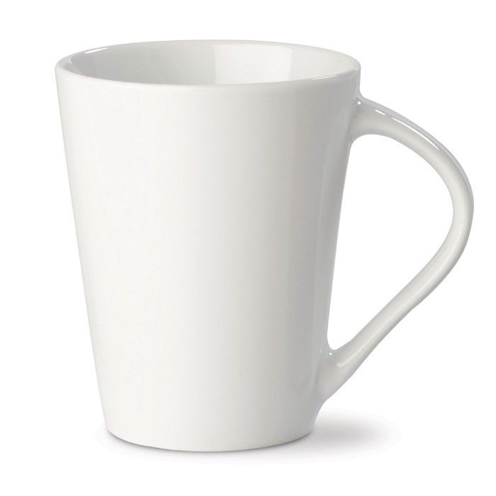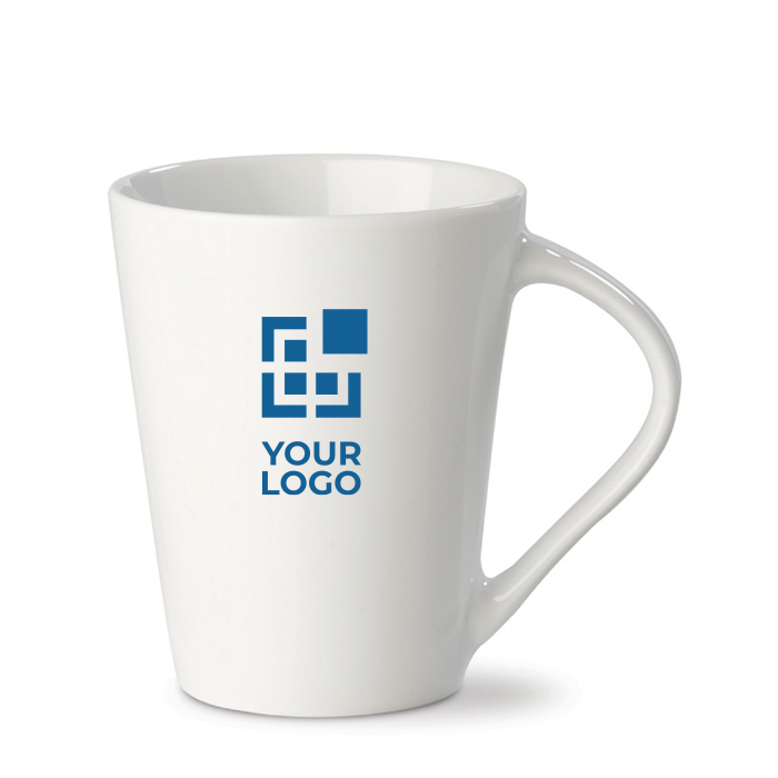 Taza de porcelana blanca con diseño cónico, ideal para personalizar con tu logotipo y presentar en cualquier ocasión. Un toque moderno para tus bebidas diarias.