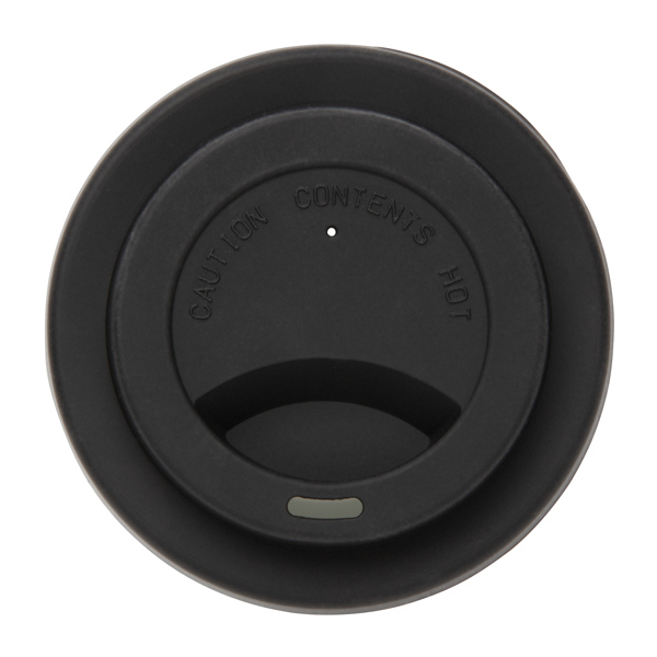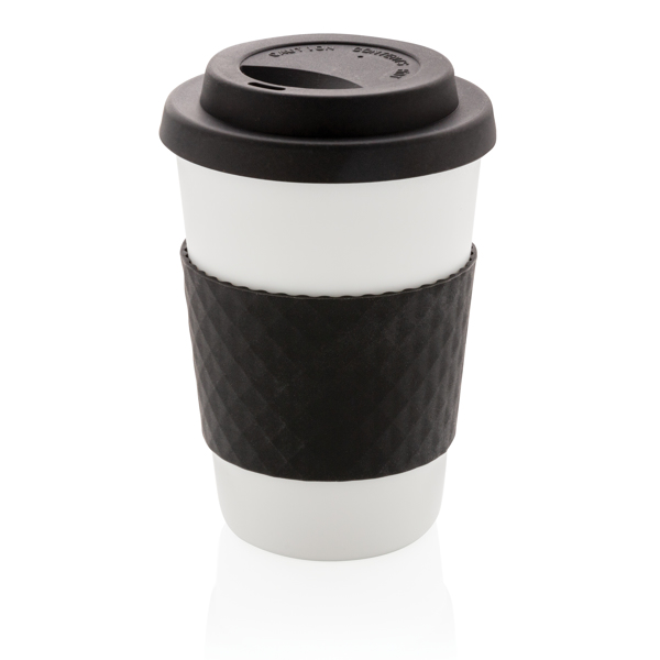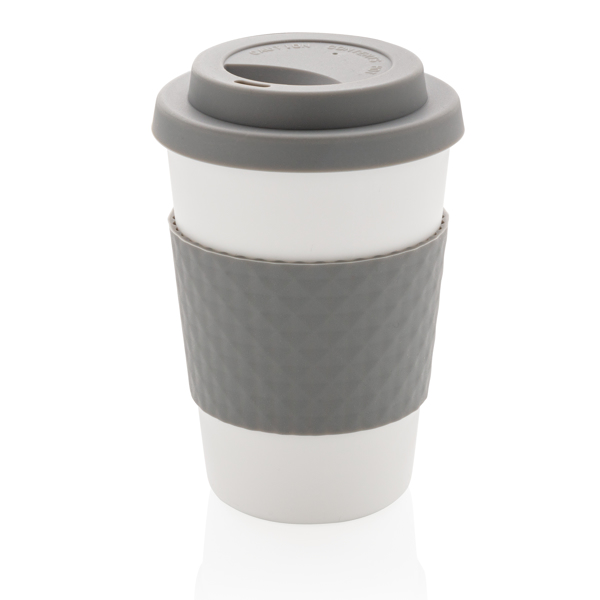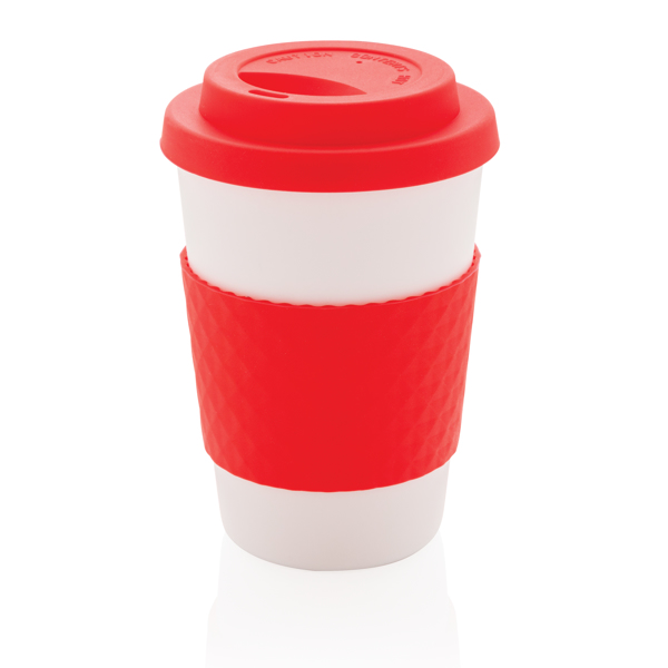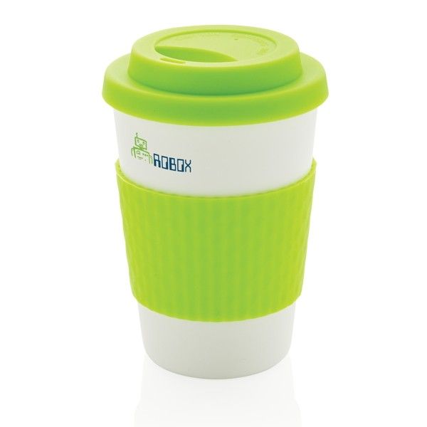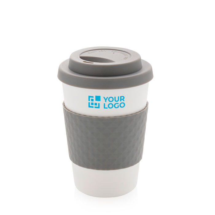 Taza reutilizable de café para llevar, en material PP 100% reciclable. Segura para alimentos de 100 grados Celsius. Capacidad de 270 mililitros y con tapa y funda de silicona. Es apta para microondas y lavavajillas. Se adapta a la mayoría de cafeteras.
