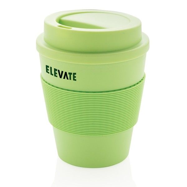 Taza reutilizable en material PP 100% reciclable. Puede contener hasta 350 mililitros. La tapa es de rosca y tiene una cinta de silicona. Es segura para alimentos de 100 grados Celsius. Apta para lavavajillas y microondas.