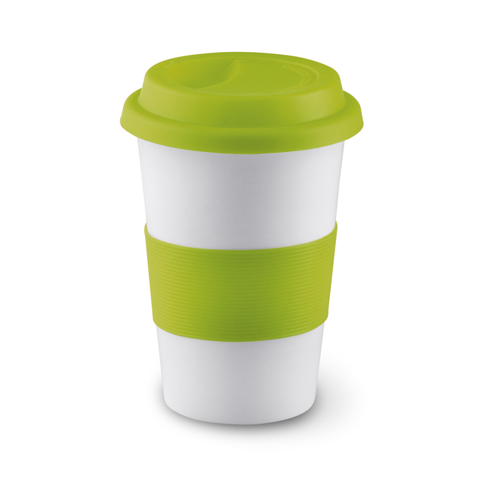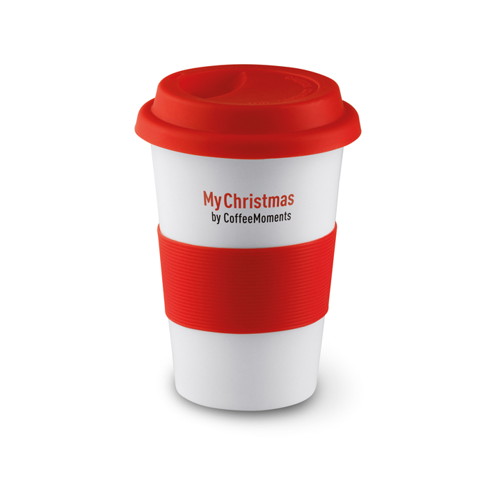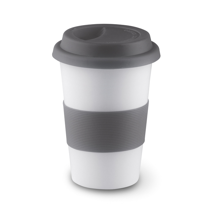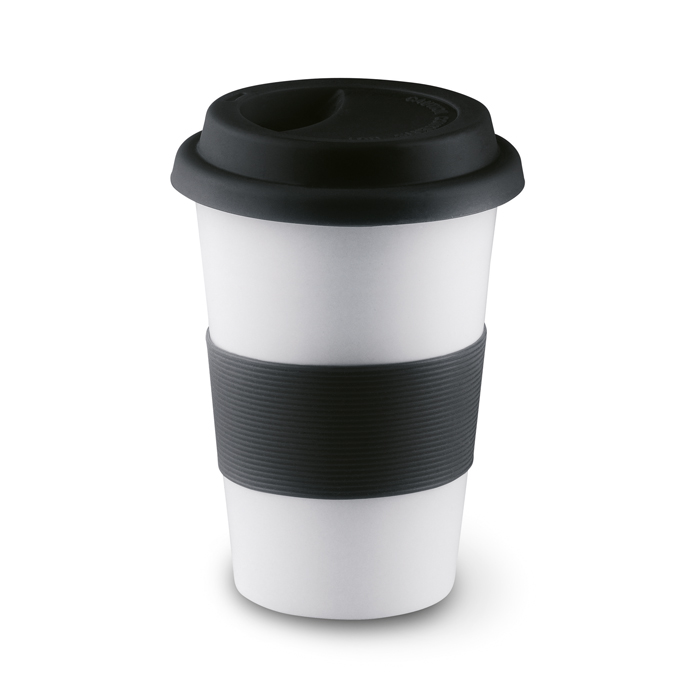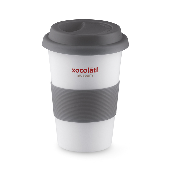 Taza take away personalizada con una capacidad de 400 ml (algo superior que los modelos estándar y permitiendo llevar una mayor cantidad de bebida en ellas) y con tapa y banda de silicona elegible en multitud de colores, permitiendo así que esta encaje con la imagen de la empresa. La impresión del logotipo es apta para lavavajillas, facilitando así su lavado aunque, por otro lado, no es posible meterla en el microondas.