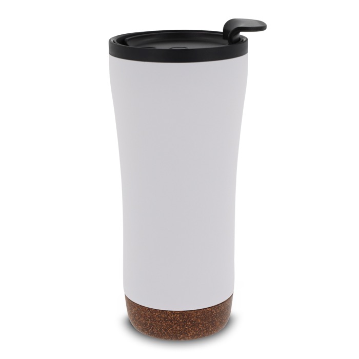 Taza de café con aislamiento de doble pared, acero inoxidable exterior y PP interior. Su tapa con abertura mantiene la temperatura del café o té por más tiempo, y su base de corcho previene marcas en la mesa. Presentada en caja de regalo.