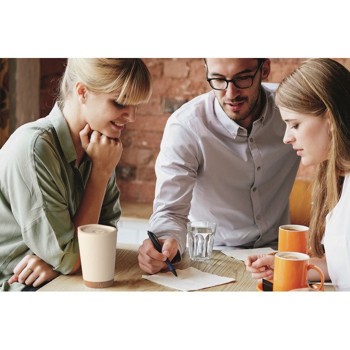 - Vaso de 300 ml con doble pared en PP y base de corcho natural que aporta estabilidad y un toque distintivo