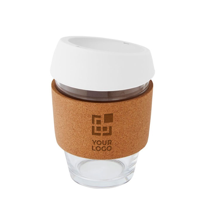 Vasos take away para acciones publicitarias. Puedes personalizarlos y fomentar la visibilidad de tu marca. Fabricados de vidrio y con agarre de corcho.