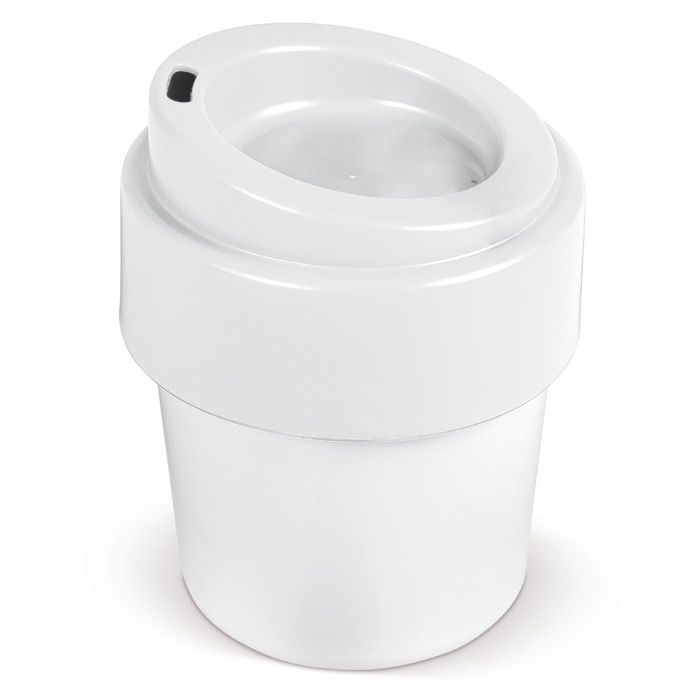 Vaso de café TopEarth fabricado en Alemania con 95% de plástico orgánico de caña de azúcar. Resistente, apilable, reutilizable y reciclable. Mantiene el café caliente y el borde exterior frío.