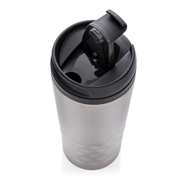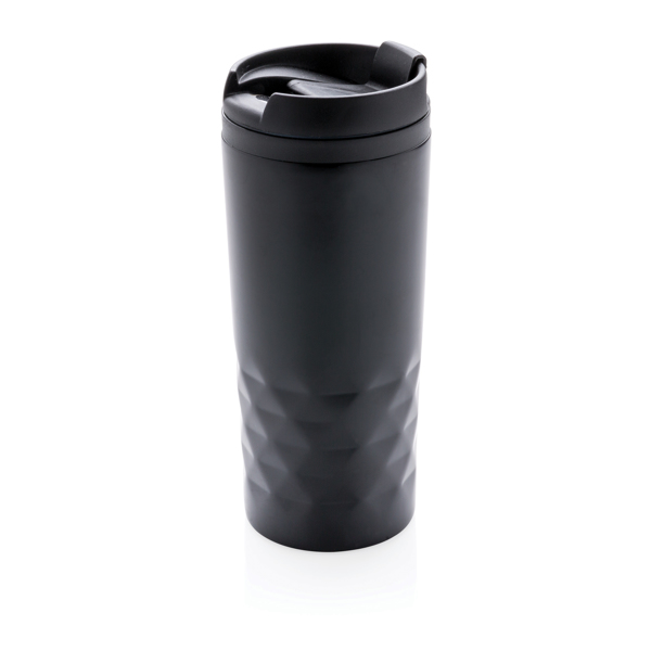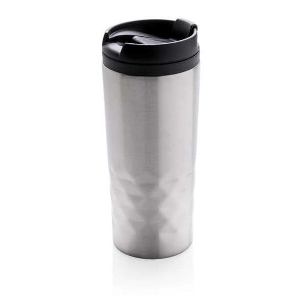 Moderna taza de acero inoxidable con detalles geométricos. Cuerpo interno de plástico. Únicamente lavar a mano. Contenido 300ml.