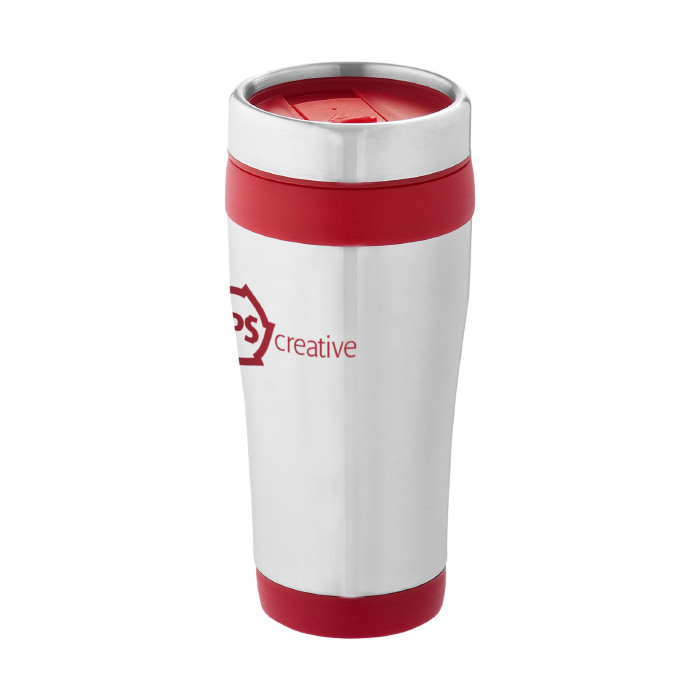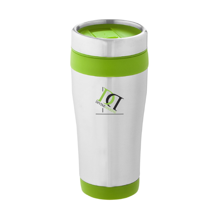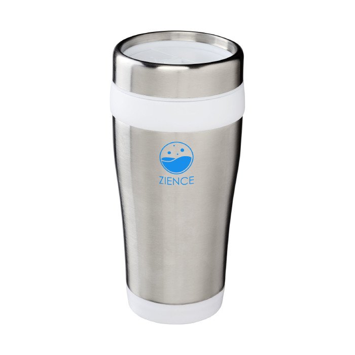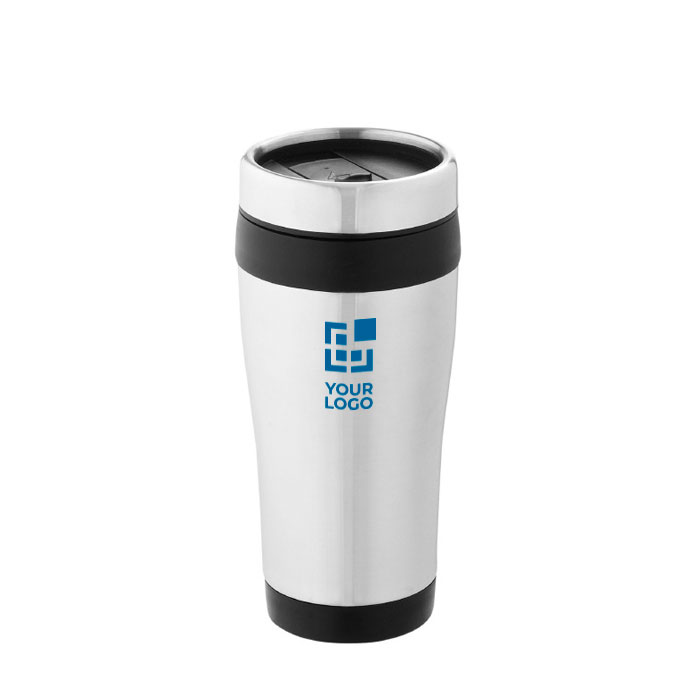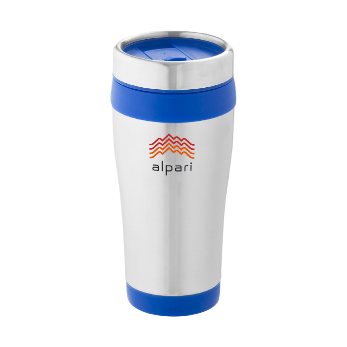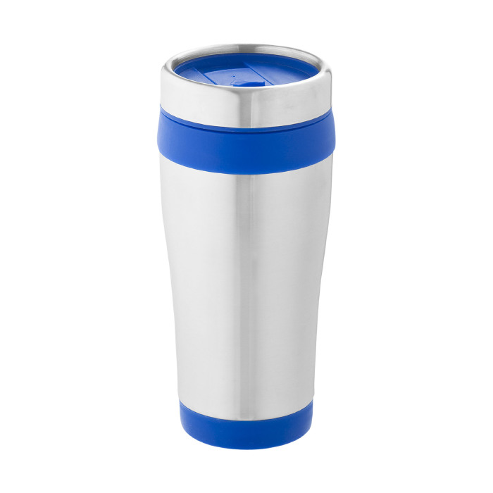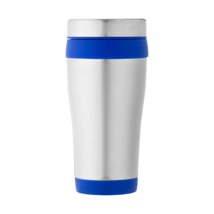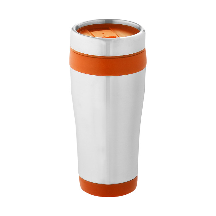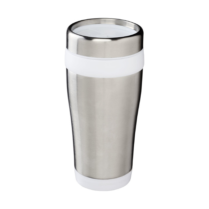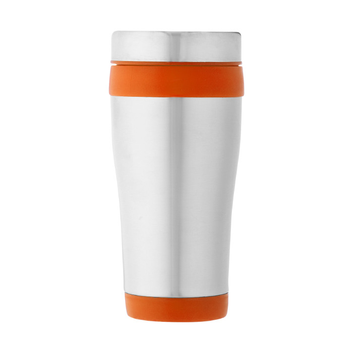 Vaso isotérmico de doble pared con tapa de rosca con apertura de pulgar. Capacidad en volumen 410 ml. Exterior de acero inoxidable, interior de plástico.