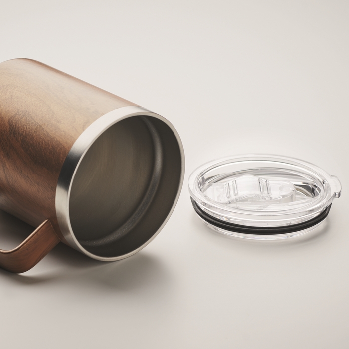 Taza con doble pared y tapa deslizante. Exterior de madera simulada y fabricada mayormente reciclada.