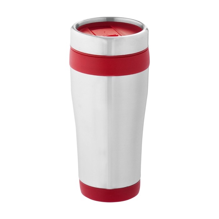 Vaso de acero inoxidable reciclado con certificación RCS, aislamiento de doble capa para mantener las bebidas frías o calientes. Tapa de rosca ajustable con pulgar. Capacidad de 410 ml.