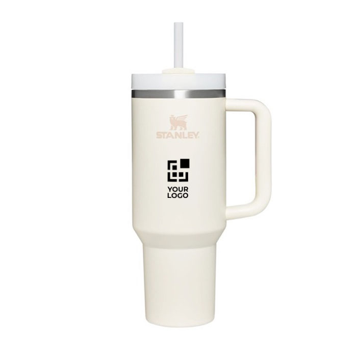 Vasos personalizados de la marca Stanley. Pon tu marca a la moda con este recipiente en tendencia. Cuenta con tapa giratoria para beber de manera cómoda.