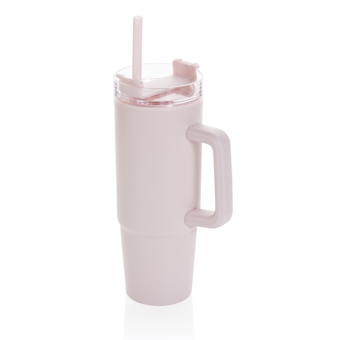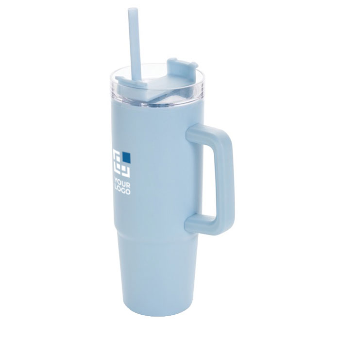 Vaso Tana de plástico de doble pared (900 ml) fabricado con un 80% de material reciclado. Ideal para trabajo, ejercicio o viajes. Tapa giratoria con tres posiciones, mango ergonómico y base que se adapta a portavasos. Lavar a mano. Empaquetado en caja kraft certificada FSC®.