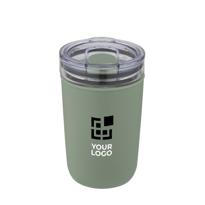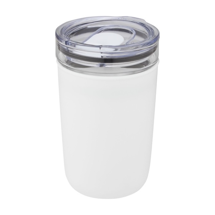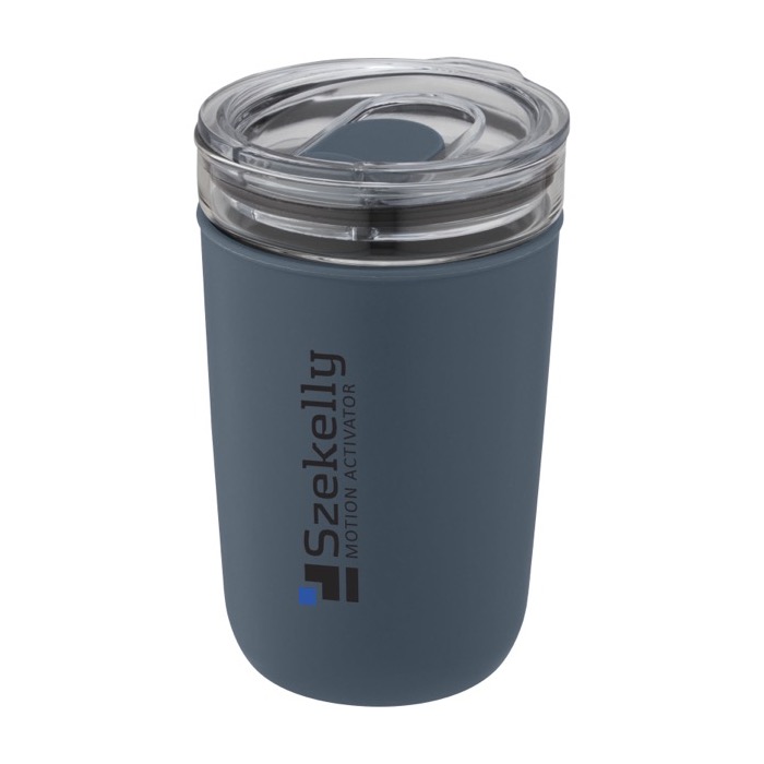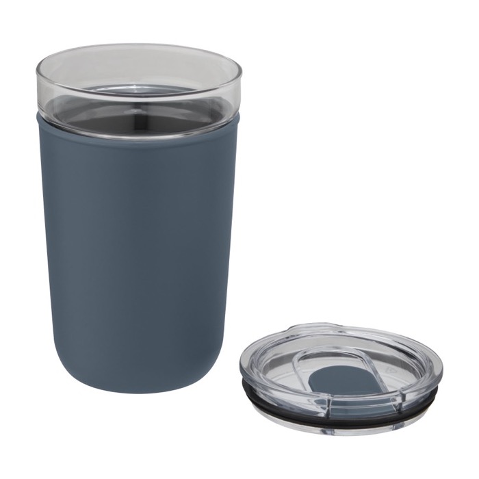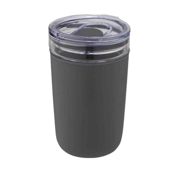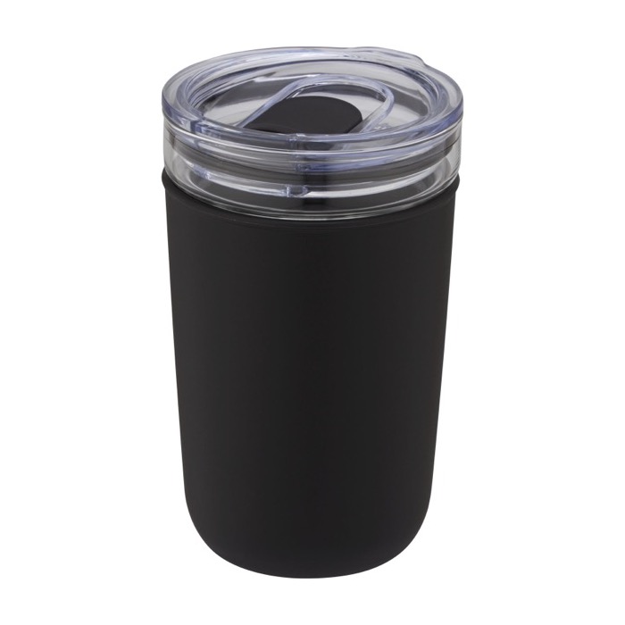 Vaso termo corporativo que cuida el sabor de la bebida gracias a que está fabricado de vidrio borosilicato y recubierto de plástico reciclado para protegerlo.
