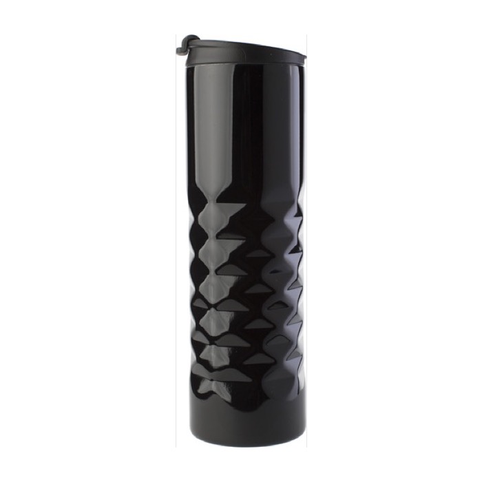 Vaso de acero inoxidable con doble pared y diseño geométrico, pensado para mantener bebidas frías o calientes. Una alternativa resistente y con estilo.