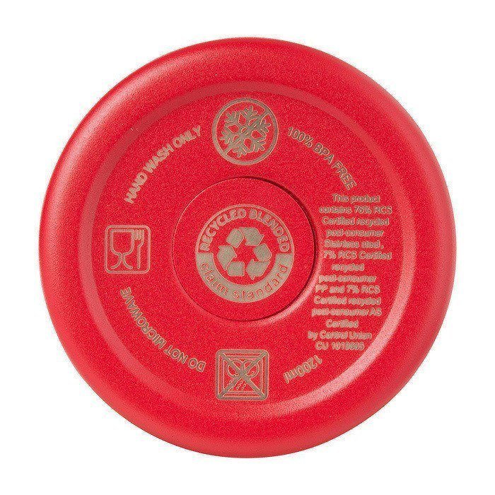 - Tapa giratoria de plástico 100% reciclado con sistema deslizante que evita derrames y mantiene la pajita en su sitio