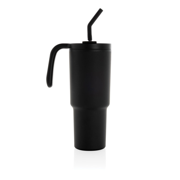 Vaso de 900 ml fabricado con materiales reciclados, con impresión a 360°. Incluye tapa giratoria de tres posiciones y base delgada compatible con portavasos.