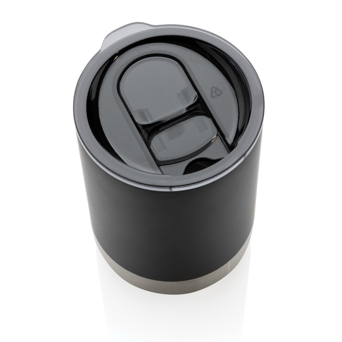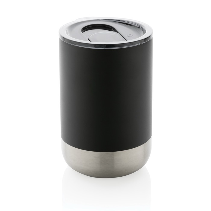 Vaso de acero inoxidable reciclado con aislamiento al vacío para mantener las bebidas calientes (3h) o frías (6h). Con tapa antigoteo y certificado RCS. Presentado en embalaje kraft FSC®.