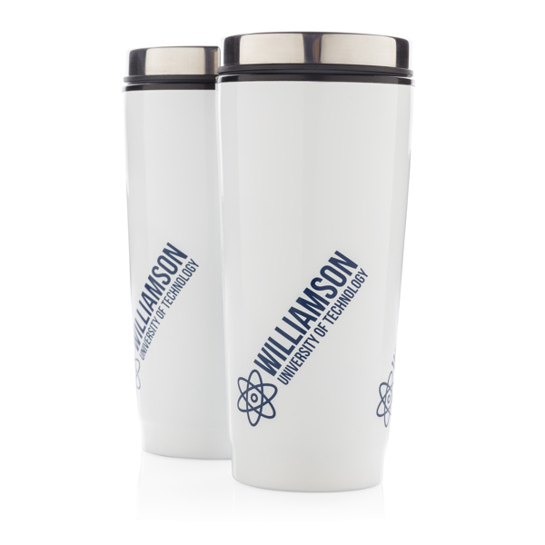 Vaso antigoteo en acero con tapa de rosca de diseño sencillo que hará que tu logo destaque, generando visibilidad y reforzando tu marca. Ideal para promociones.