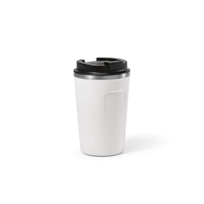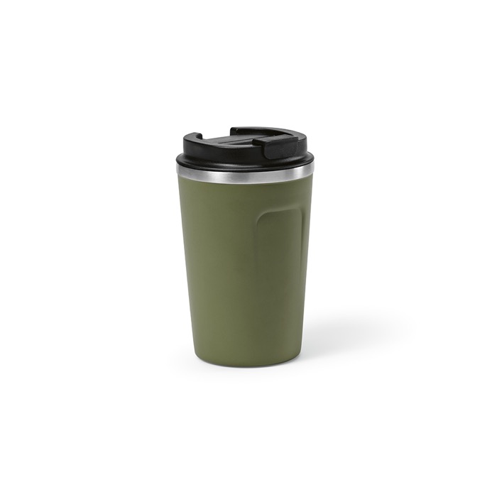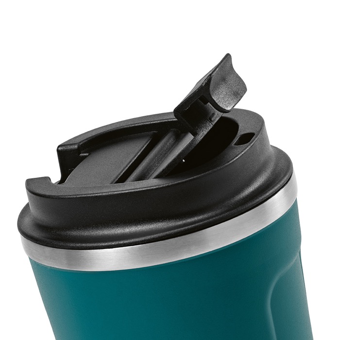 Vaso de viaje de acero inoxidable reciclado de 490 ml (400 ml netos), con aislamiento de doble pared que mantiene las bebidas a la temperatura ideal. Una opción sostenible y elegante para tus rutinas diarias.