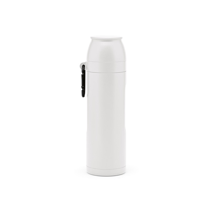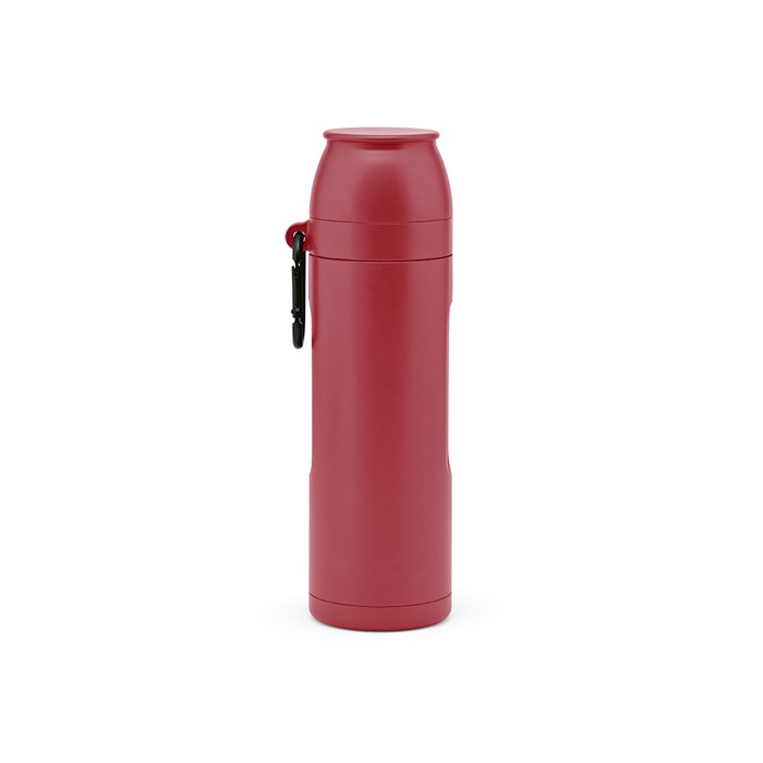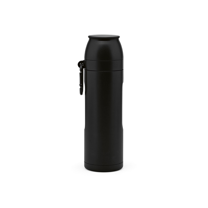 Lleva tu termo de acero reciclado con mosquetón a cualquier evento. Doble pared para mantener la temperatura y dos tazas. Ideal para regalos corporativos.
