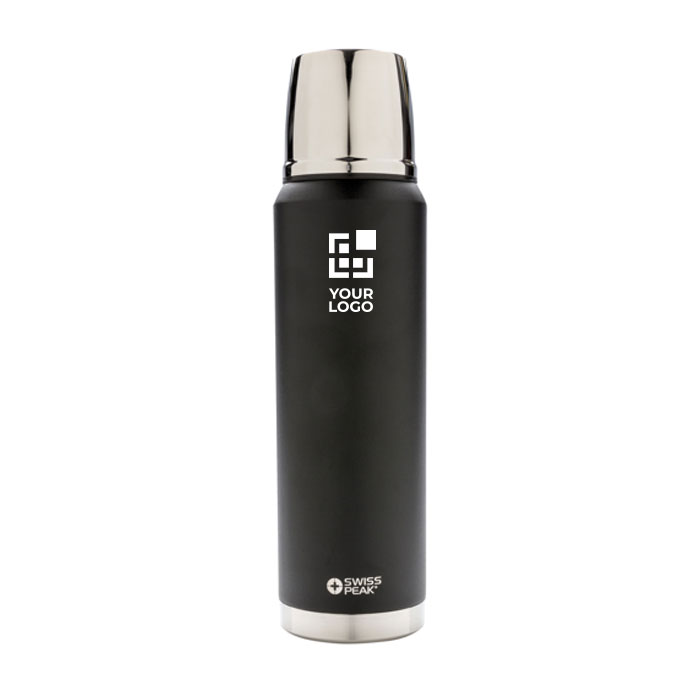 Termo Swiss Peak de aislamiento al vacío y doble pared de acero inoxidable 18/8, con recubrimiento negro duradero. Mantiene las bebidas calientes por 8h y frías por 24h. Capacidad de 1L. Ideal para quienes buscan estilo y funcionalidad.