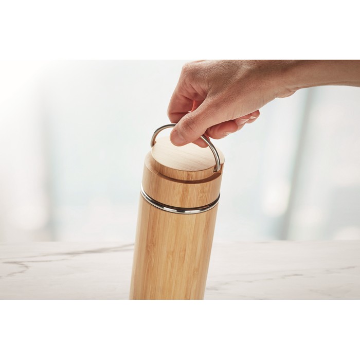 Si te gusta el té esta opción de merchandising corporativo será todo un acierto. Termo aislante de doble pared de acero inoxidable y bambú con infusor de té.