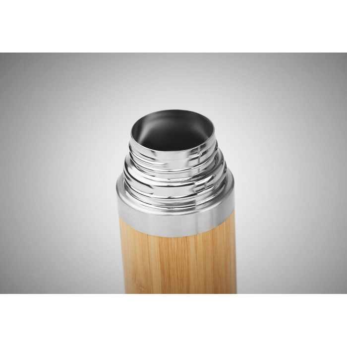 Huyendo de un aspecto metálico, este termo personalizado con carcasa de bambú, mantiene las mismas ventajas de impresión y grabado del logotipo.