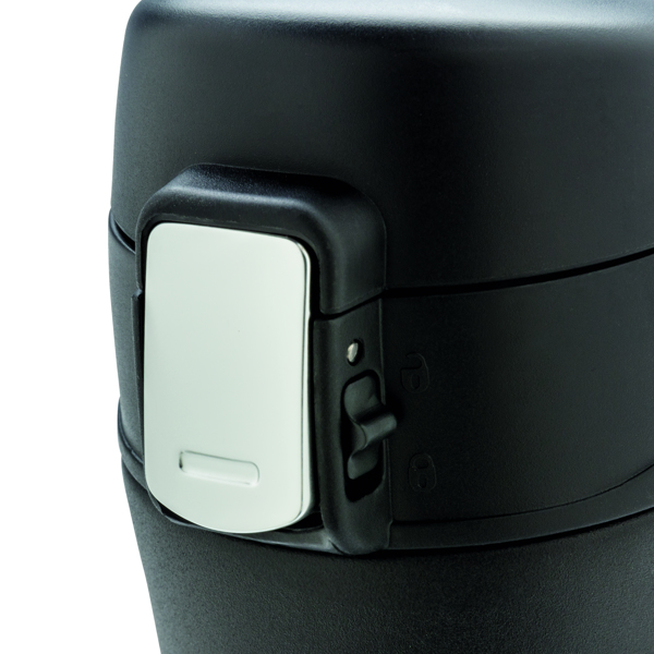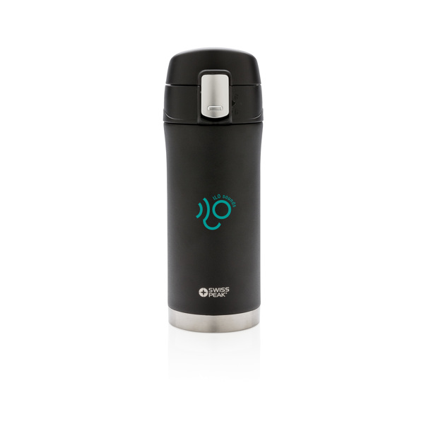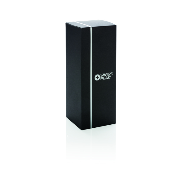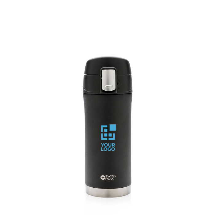 Termo Swiss Peak de 300 ml con doble pared de acero inoxidable 18/8, aislamiento al vacío y recubrimiento negro resistente. Mantiene las bebidas calientes durante 8 horas y frías hasta 24. Tapa bloqueable que previene goteos. Se recomienda lavar a mano.