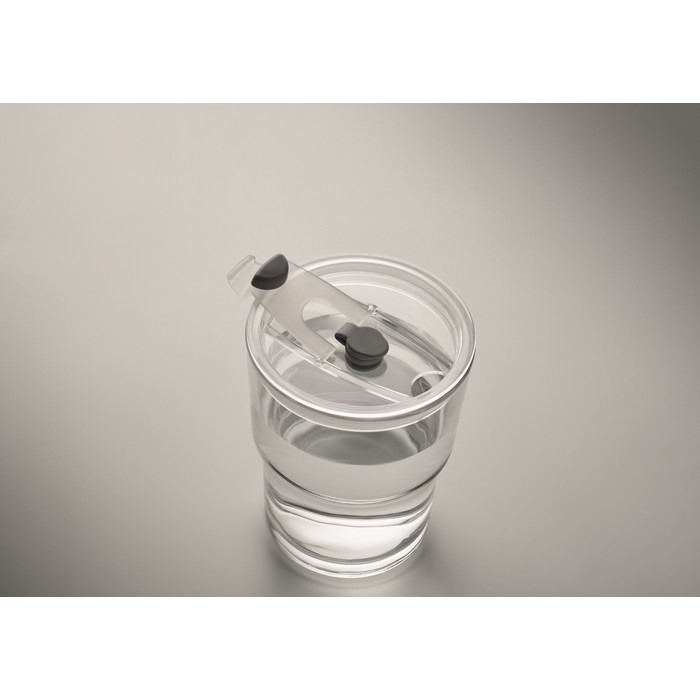 Vaso de cristal de 300 ml con tapa y pajita extraíble. Su diseño antigoteo lo convierte en un detalle promocional práctico y elegante para tu marca.