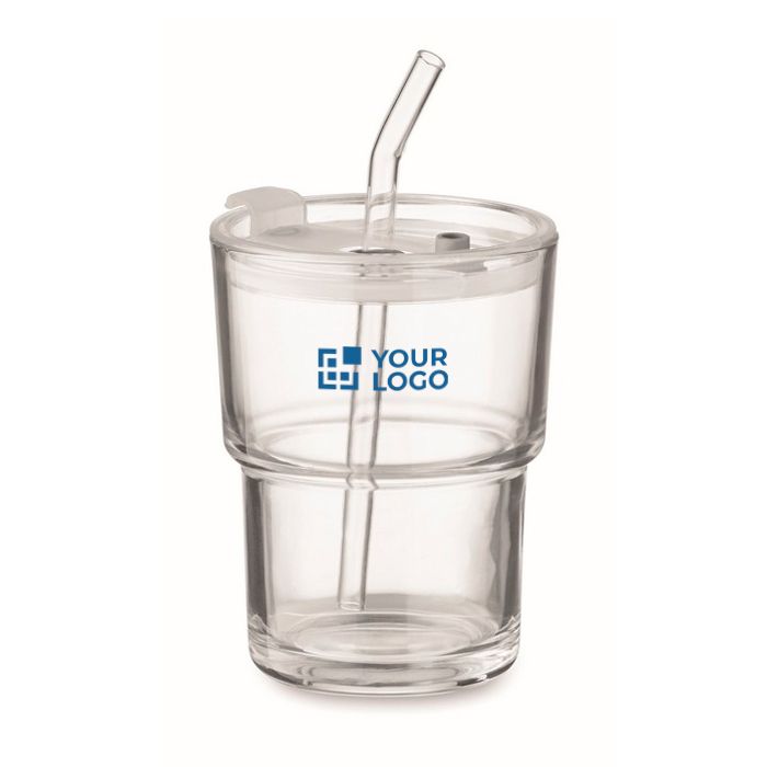 Vasos de cristal corporativos con tapa y pajita 300ml